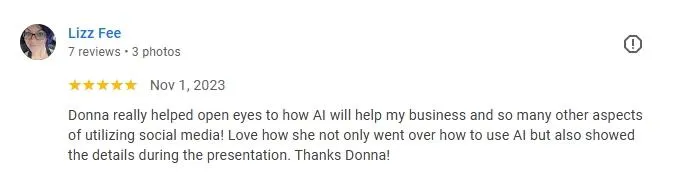 Donna really helped open eyes to how AI will help my business and so many other aspects of utilizing social media! Love how she not only went over how to use AI but also showed the details during the presentation. Thanks Donna!