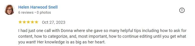 I had just one call with Donna where she gave so many helpful tips including how to ask for content, how to categorize, and, most important, how to continue editing until you get what you want! Her knowledge is as big as her heart